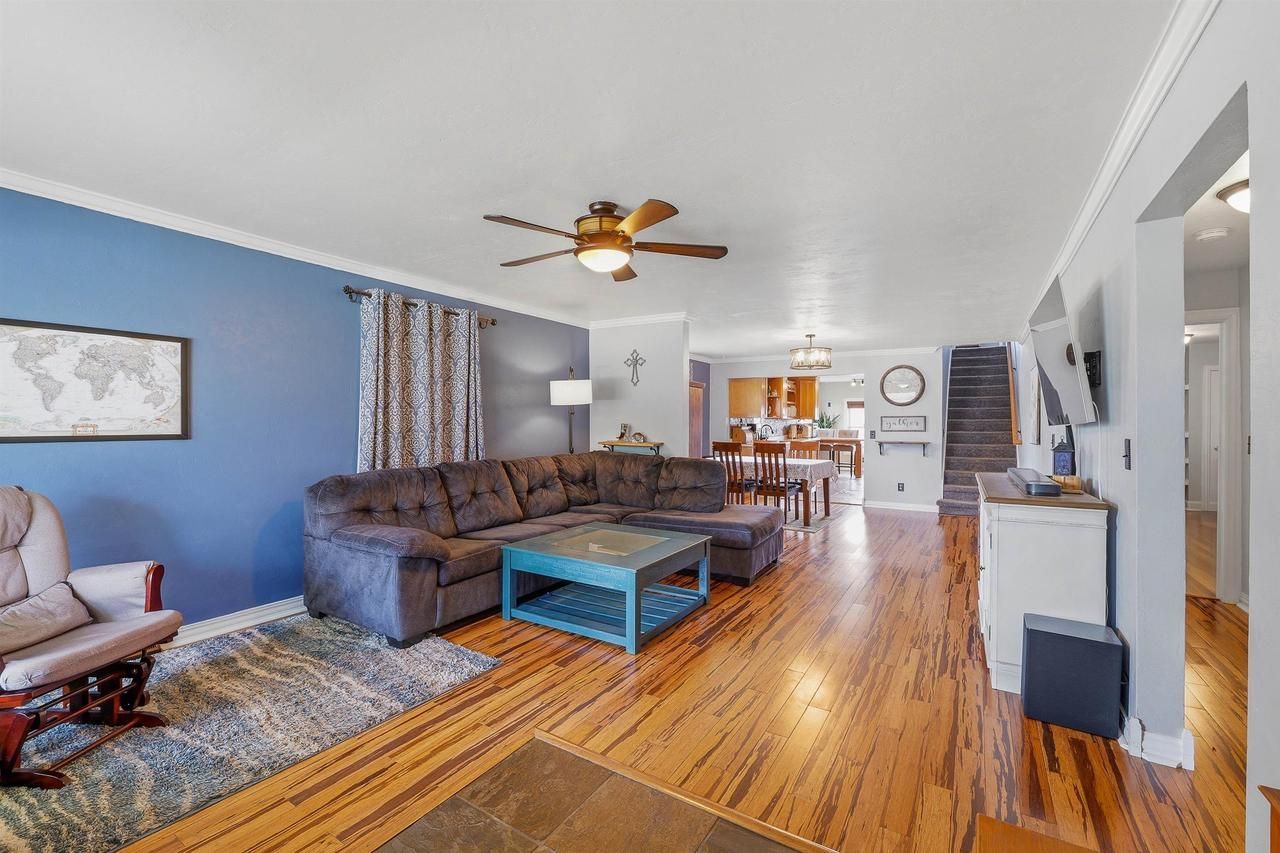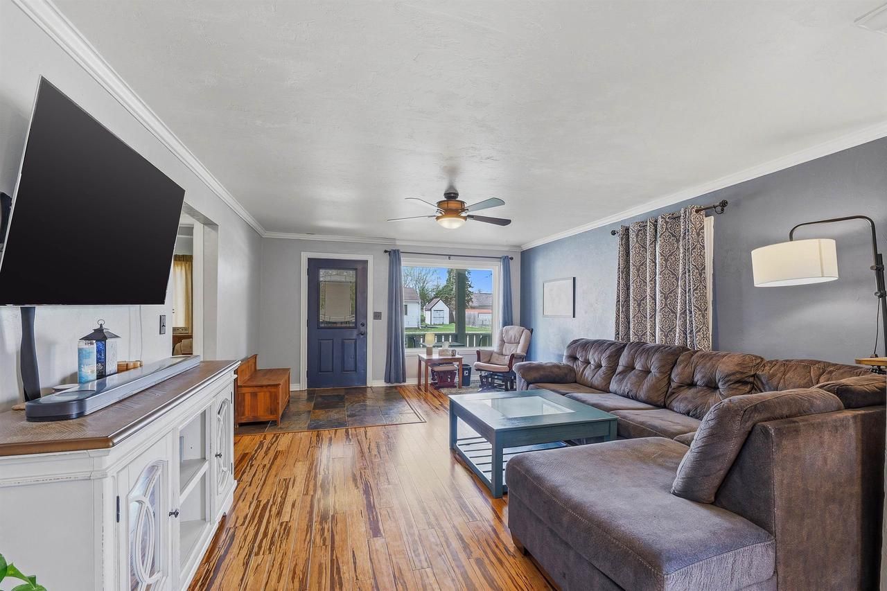 Charming 1.5 story updated home with 3 bed/2baths. Open concept on the main floor with a spacious living room, dining room and kitchen all flowing nicely together for entertaining. Kitchen has maple cabinets, tiled backsplash, 24" slate floor tiles and newer appliances. Sizable main floor laundry/mud room, 2 main floor large bedrooms and full bath. Upstairs is another large bedroom and bathroom with a walk in shower and large walk in closet. Bsmt has tall ceilings and the potential to be finished. New roof in '22, water heater '25, and c/a '20. Don't miss out on this one!! Showings start Mon 4/20
